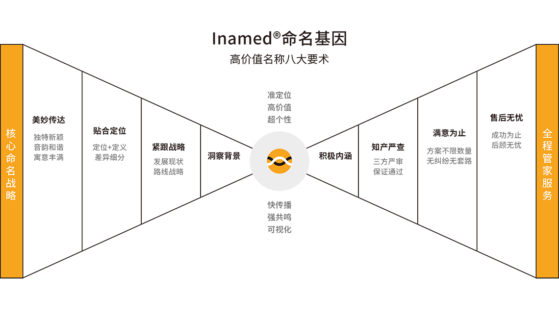 根據目標群體需求特征以及品牌起名定位,通過字義、字音、字性等多種方法,創意命名方案;對名稱進行商標注冊系統篩查等。
